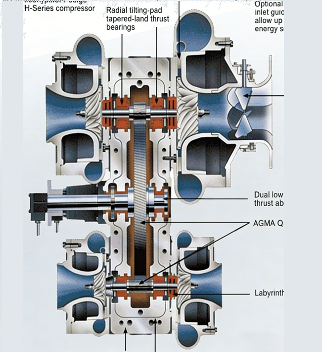齿轮箱中一个大齿轮驱动几个小齿轮,每个轴的一端或两端安装有叶轮。叶轮轴向进气,径向排气,以管道连接各级,从动轴转速不同,各级均在最佳状况下运行。适用于中低压空气、蒸汽等气体。